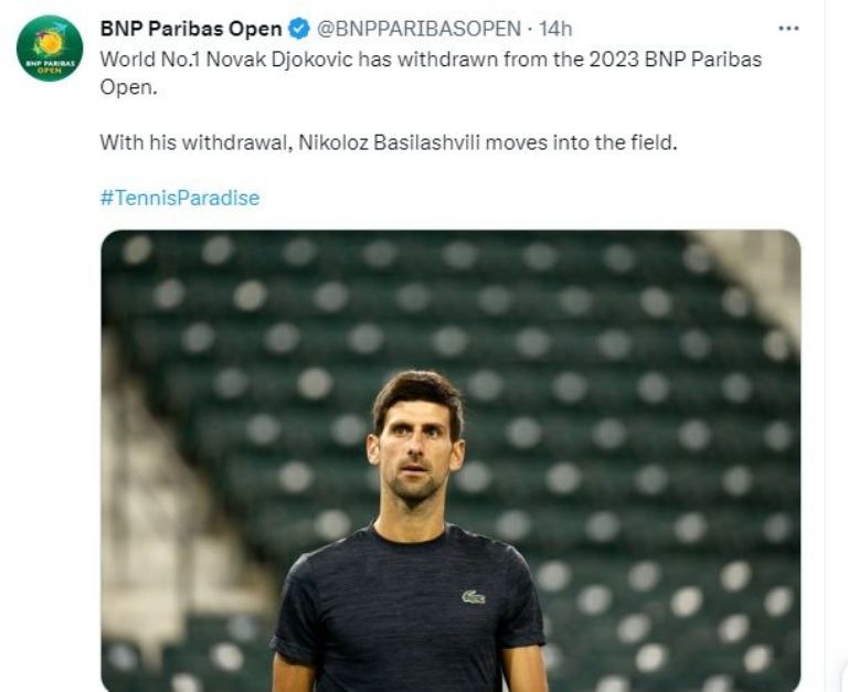 "Novak Djokovic, número 1 del mundo, se ha retirado del BNP Paribas Open 2023. Con su retirada, Nikoloz Basilashvili entra en el cuadro", informaron los organizadores a través de su cuenta de Twitter, anunciando al tenista georgiano en su lugar, quien fue finalista de la edición de 2021 que perdió ante Cameron Norrie. Será una sensible baja del torneo de Indian Wells que comeinza este seis de marzo y se extenderá hasta el 19.