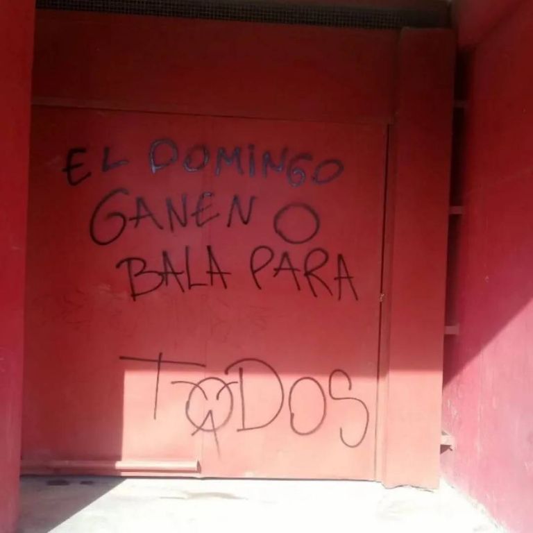 En un par de pintas anónimas en las instalaciones del equipo se pudo leer una amenaza en la que escribieron “El domingo ganen o bala para todos”, en referencia al partido contra Racing en uno de los clásicos más importantes del futbol argentino por lo que con ese mensaje buscaron intimidar a los integrantes del equipo y también se encontraron con otro mensaje en el que escribieron “el día que matemos un dirigente van a dejar de robarnos”.