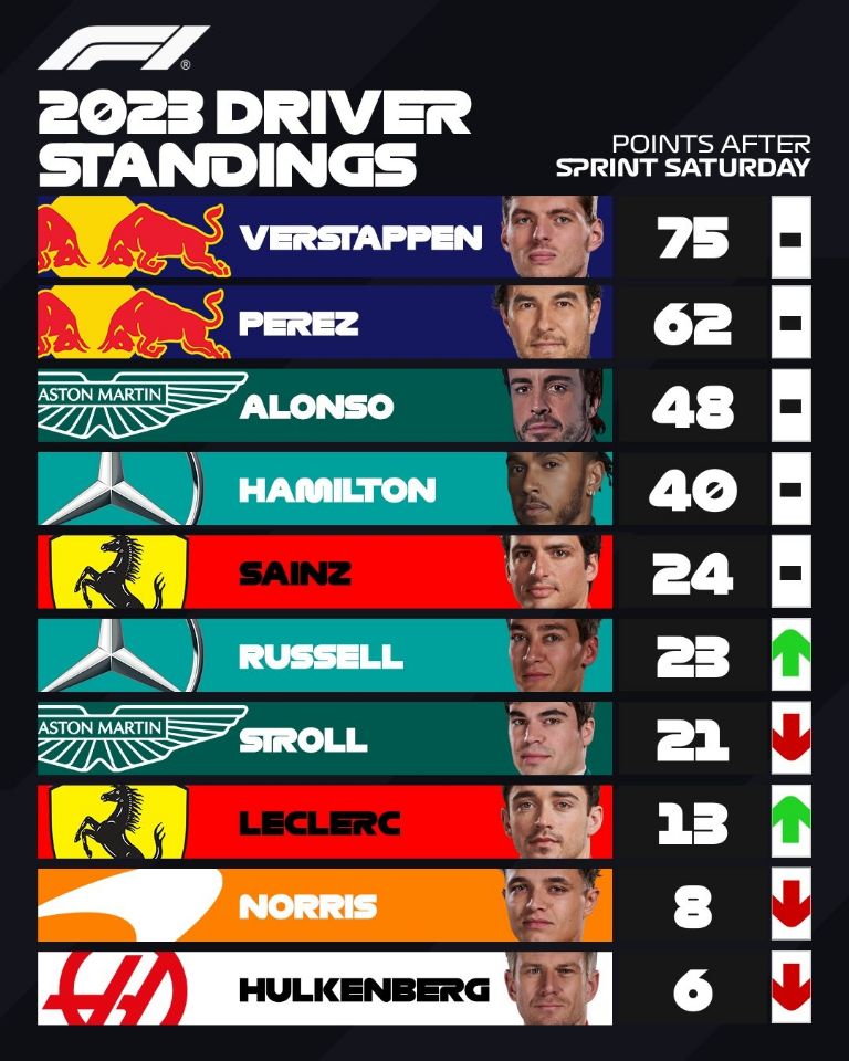 Con esas unidades Pérez se encuentra en segunda posición con 62 puntos, mientras que Verstappen sumó seis unidades que lo mantienen en primera posición con 75 puntos. Mientras que Fernando Alonso es tercero de la clasificación con 48 unidades. Tras la carrera de este fin de semana los otros GP que tendrán carrera Sprint serán Austria, Bélgica, Qatar, Estados Unidos y en el GP de Sao Paulo en Brasil.