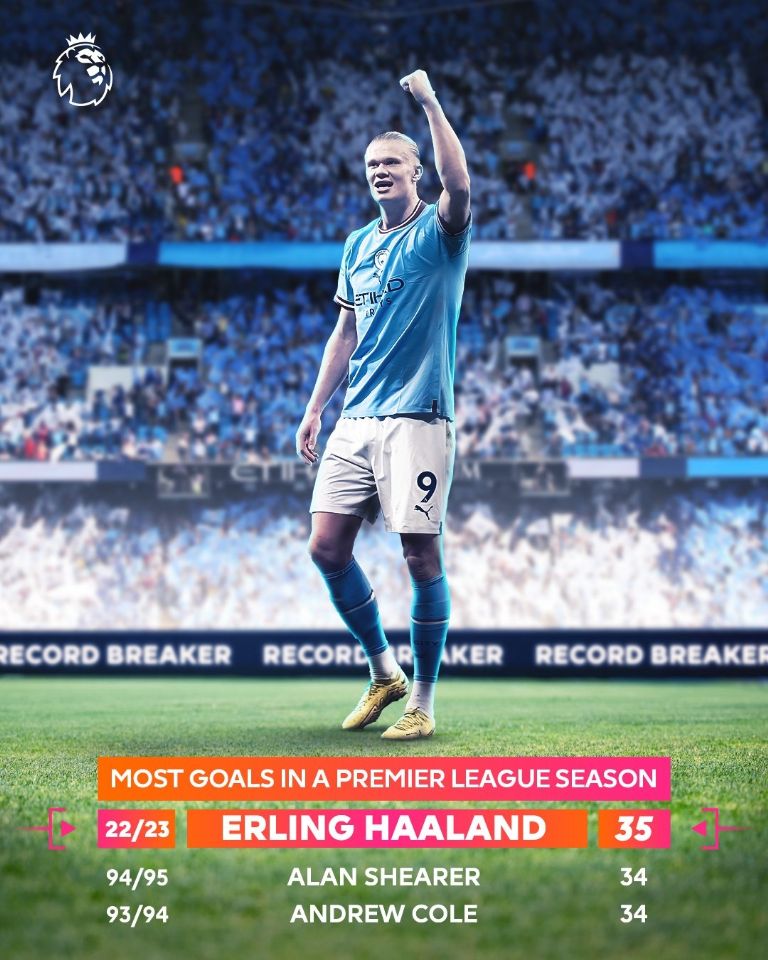 Haaland llegó a 35 goles en la Premier League dejando atrás los 34 goles que anotaron Andrew Cole (durante la temporada 1993-1994) y Alan Shearer (durante la temporada 1994-1995), en este caso ambos jugadores lo hicieron en una temporada de 42 partidos, en tanto que Haaland disputa una temporada de 38 juegos, y lo acaba de conseguir en 33 juegos jugados por lo que resta saber la nueva marca que finalmente impondrá.