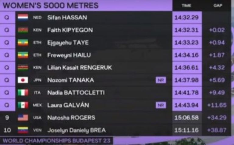 La ganadora de esta prueba fue la atleta de Países Bajos, Sifan Hassan con un tiempo de 14:32:29, meintras que el segundo puesto fue para Fatih Kipyegon de Kenya, quien marcó 14:32:31. Ambas son de las favoritas para llevarse las medallas. Será el próximo sábado 26 de agosto cuando la mexicana busque la medalla en la final de la prueba de los cinco mil metros que podrá seguirse a través de la señal de YouTube de Claro Sports o en su canal de paga.