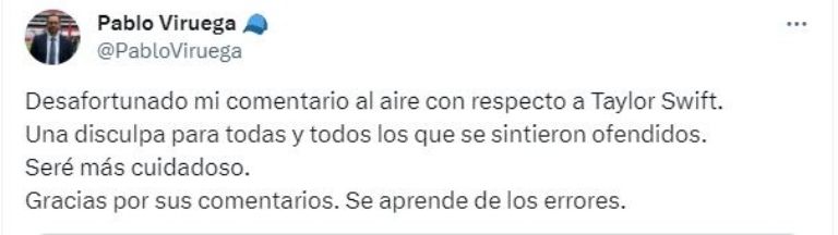 Fue a través de sus redes sociales y acompañado de una fotografía de la cantante pop, que lamentó lo dicho y pidió disculpas. “Desafortunado mi comentario al aire con respecto a Taylor Swift. Una disculpa para todas y todos los que se sintieron ofendidos. Seré más cuidadoso. Gracias por sus comentarios. Se aprende de los errores”, expresó el comentarista deportivo sobre este caso que no pasó desapercibido.