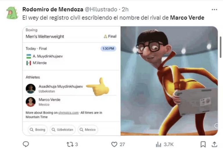 Contra todo pronóstico, el mexicano se mantuvo a la cabeza en este último asalto. De cualquier modo, la decisión ya estaba tomada y fue Muydinkhujae quien colgó sobre su cuello la medalla de oro, dejando a Verde con el sabor de la plata. Si bien fue un excelente lugar, los internautas dejaron ver que se sentían tristes porque no pudo subirse a lo más alto del podio. ¿Y qué mejor forma que demostrar la desilusión que con graciosos memes? Pues si algo saben hacer los mexicanos es verle el lado cómico a cualquier situación, por muy lamentable que sea. Aquí te dejamos las imágenes más chistosas que circulan en X (antes Twitter) y que acumulan decenas de 'me gusta'.