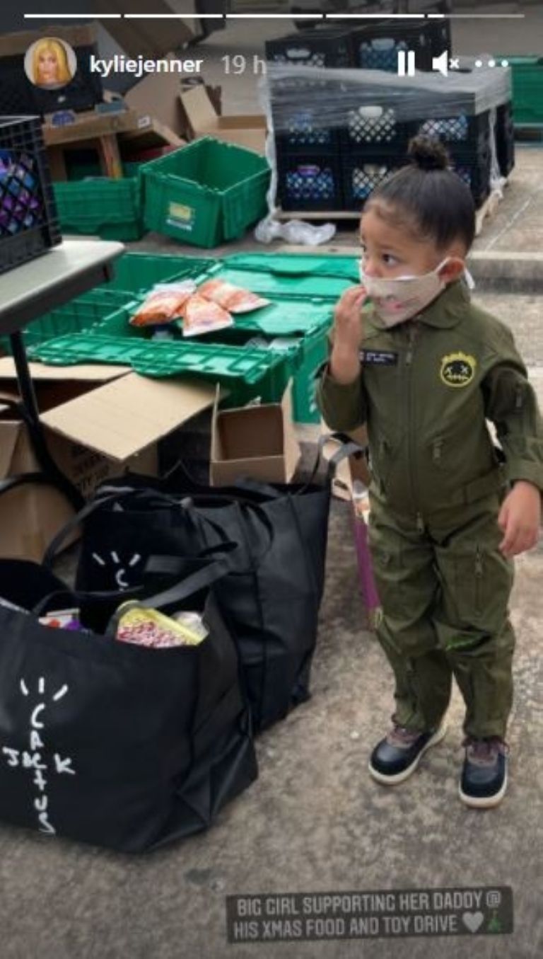 Así mismo, la modelo y empresaria de Kylie Jenner, quien es exnovia y madre de la hija del rapero, también asistió en compañía de la pequeña, la cual iba vestida adorablemente con un traje completo verde militar y un cubrebocas para evitar la propagación del virus.
