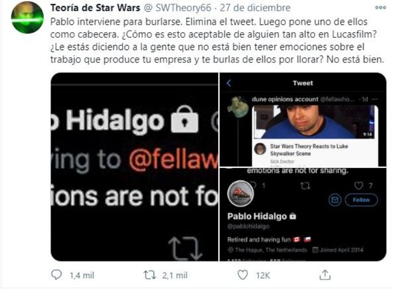 Sin embargo, el youtuber que está en Twitter como '@SWTheory66', afirmó que la publicación de Hidalgo era bastante inaceptable para alguien tan alto en Lucasfilm. Sin embargo, en este punto, Pablo ya había eliminado el tuit, pero había agregado una captura de pantalla como banner de su perfil.
