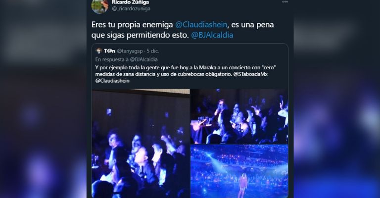 Y por ejemplo toda la gente que fue hoy a la Maraka a un concierto con "cero" medidas de sana distancia y uso de cubrebocas obligatorio. @STaboadaMx @Claudiashein”, indicó un mensaje en Twitter.
