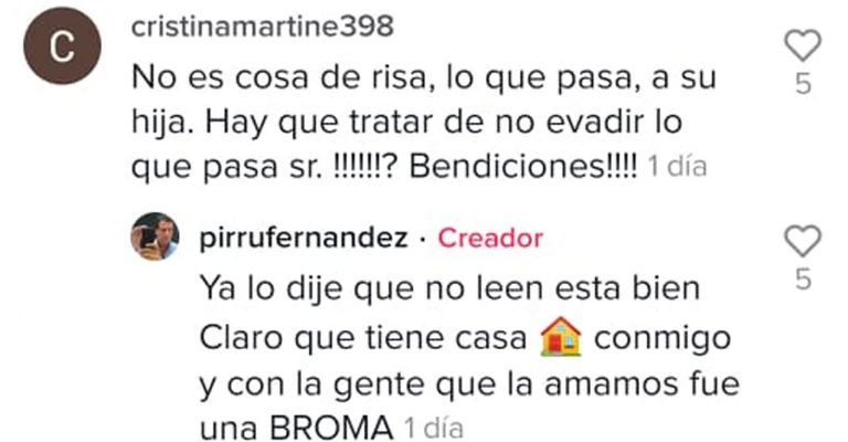 Ya lo dije ¿Qué no leen bien? Está bien, claro que tiene casa conmigo y con la gente que la amamos, fue una broma", escribió en respuesta a un usuario de TikTok.