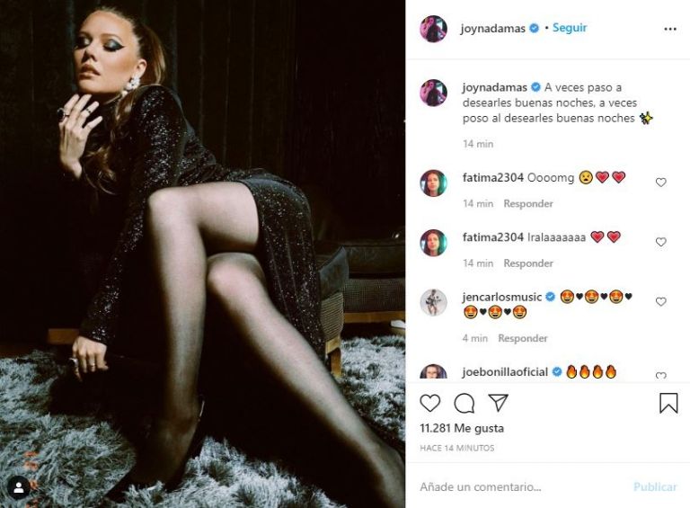 “A veces paso a desearles buenas noches, a veces poso a desearles buenas noches”, se lee en la publicación de la intérprete de La de la mala suerte, Espacio Sideral y Dueles, donde se le ve sentada sobre un sillón negro al mismo tiempo que presume sus impecables piernas.
