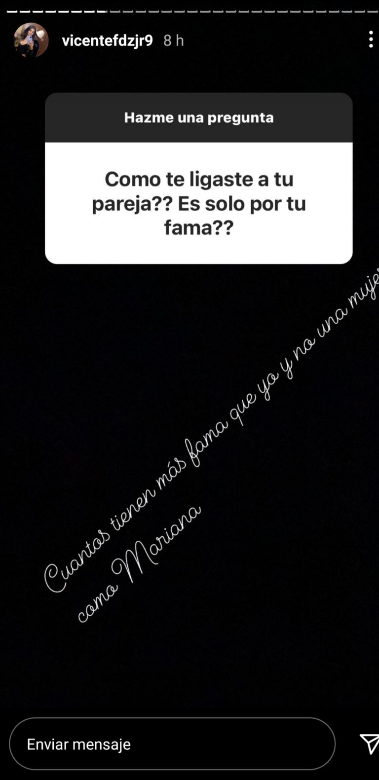 Luego que el Jr. se encontraba en una dinámica con sus seguidores de Instagram, permitió que le hicieran preguntas de todo tipo y entre ellas las suficientes eran sobre su relación con la 'Kim Kardashian mexicana', dejando claro que la unión entre ellos no es por fama pues este contestó "cuántos no tienen más fama que yo y no una mujer como Mariana".