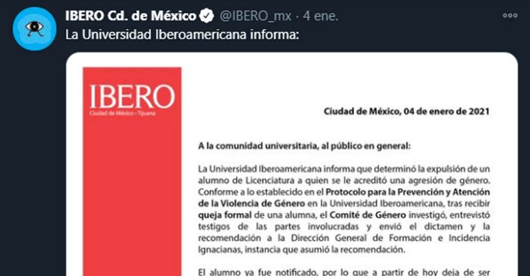 Conforme a lo establecido en el Protocolo para la Prevención y Atención contra la Violencia de Género en la Universidad Iberoamericana, tras recibir una queja formal de una alumna, el comité de Género investigó, entrevistó testigos de las partes involucradas y envió el dictamen y la recomendación a la Dirección General de Formación e Incidencia Ignacianas, instancia que asumió la recomendación", se lee en el texto.