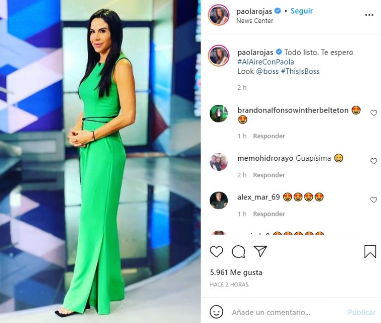 En esta ocasión Rojas apareció modelando un radiante jumpsuit de color verde vibrante que resaltó su tremenda delgadez; además llevó el cabello suelto lacio y lució sandalias de tacón negro.