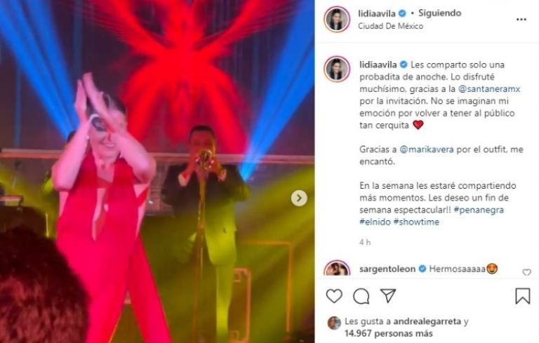 Les comparto solo una probadita de anoche. Lo disfruté muchísimo, gracias a la @santaneramx por la invitación. No se imaginan mi emoción por volver a tener al público tan cerquita", escribió Lidia.