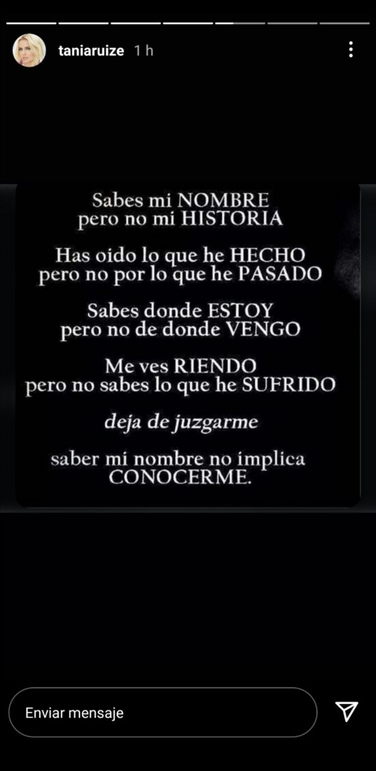 Sabes mi nombre, pero no mi historia. Has oído lo que he hecho, pero no por lo que he pasado. Sabes dónde estoy, pero no de dónde vengo. Me ves riendo, pero no sabes lo que he sufrido. Deja de juzgarme. Saber mi nombre no implica conocerme".