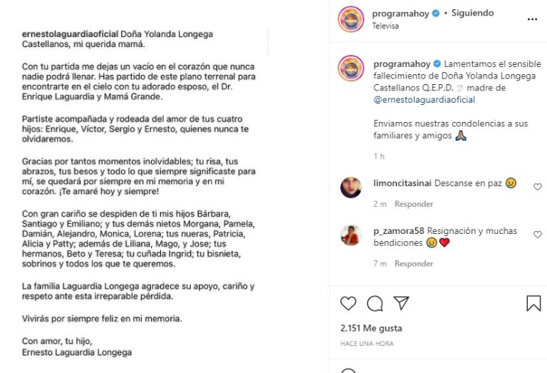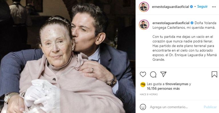 Doña Yolanda Longega Castellanos, mi querida mamá... Con tu partida me dejas un vacío en el corazón que nunca nadie podrá llenar. Has partido de este plano terrenal para encontrarte en el cielo con tu adorado esposo, el doctor Enrique Laguardia y mamá grande", escribió junto a una tierna instantánea en la que aparece con la fallecida.