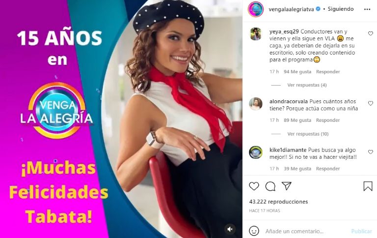 Durante la tarde de ayer martes se publicó en las redes sociales de Venga la Alegría una imagen para felicitar a Tábata por sus 15 años dentro del programa y las críticas no se hicieron esperar.