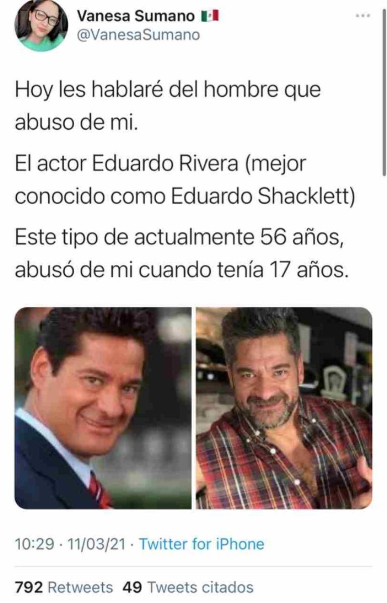 Ciudad de México.- Una joven identificada como Vanesa Sumano acusó al actor de Televisa Eduardo Rivera, mejor conocido en el medio como Eduardo Shacklett, de violación cuando ella era una menor de edad.
