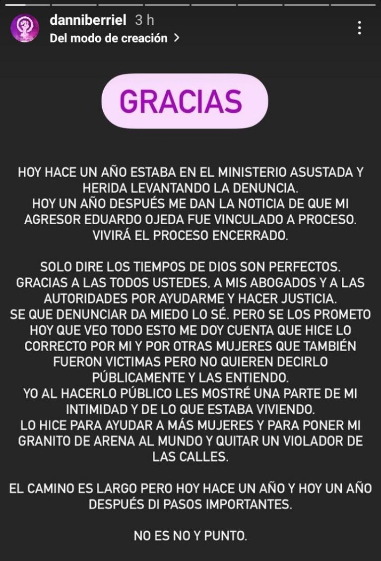 ¡Gracias! Hace un año estaba en el ministerio, asustada, herida, levantando la denuncia... ahora me dan la noticia de que Eduardo vivirá el proceso encerrado", escribió la actriz.