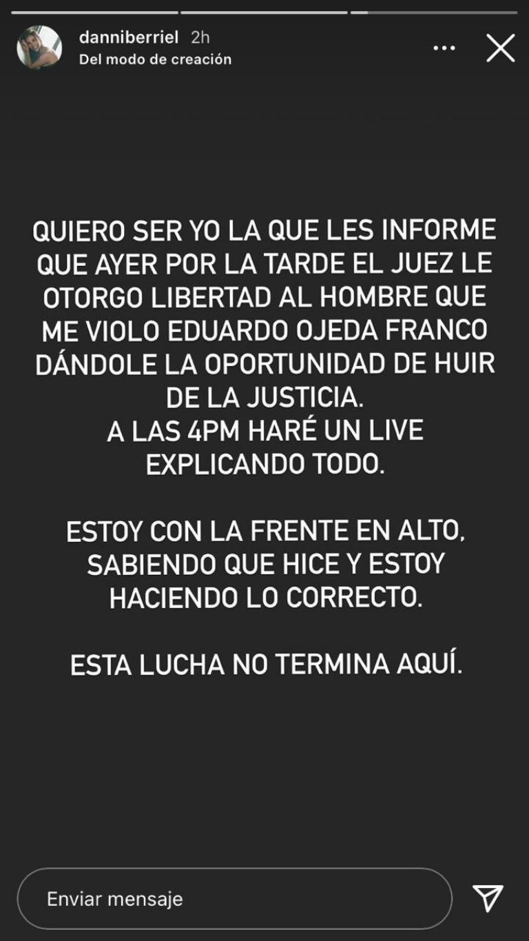 Quiero ser yo la que les informe que ayer por la tarde el juez le otorgó libertad al hombre que me violó Eduardo Ojeda Franco dándole la oportunidad de huir de la justicia", es parte del mensaje que colgó en su red social.