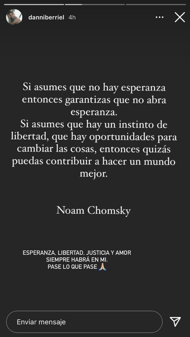 A esta frase agregó las siguientes palabras: "Esperanza, libertad, justicia y amor siempre habrá en mí. Pase lo que pase".