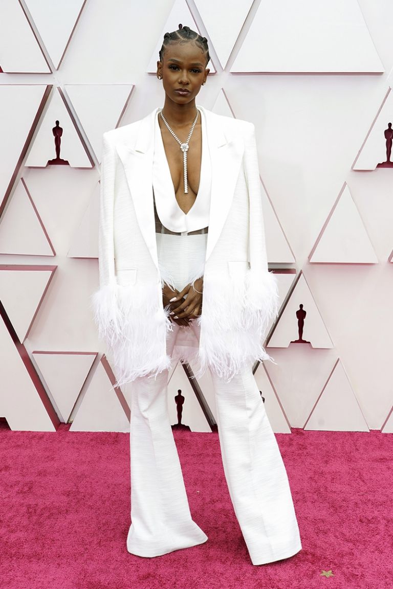 La cantautora estadounidense se arriesgó con el color blanco para desfilar por la alfombra roja. Ella está nominada a 'Mejor canción original' por su composición para Judas y el mesías negro, Fight For You. Usa un traje hecho a su medida por Jovana Louis.