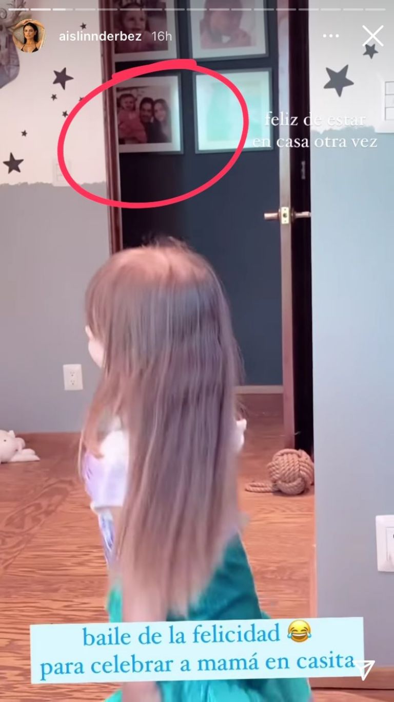Hace unos días, Aislinn dejó ver en sus historias de Instagram, que en su casa aún conserva los recuerdos de su expareja, pues mientras graba a su hija, se logra ver una fotografía del protagonista de El Chema.
