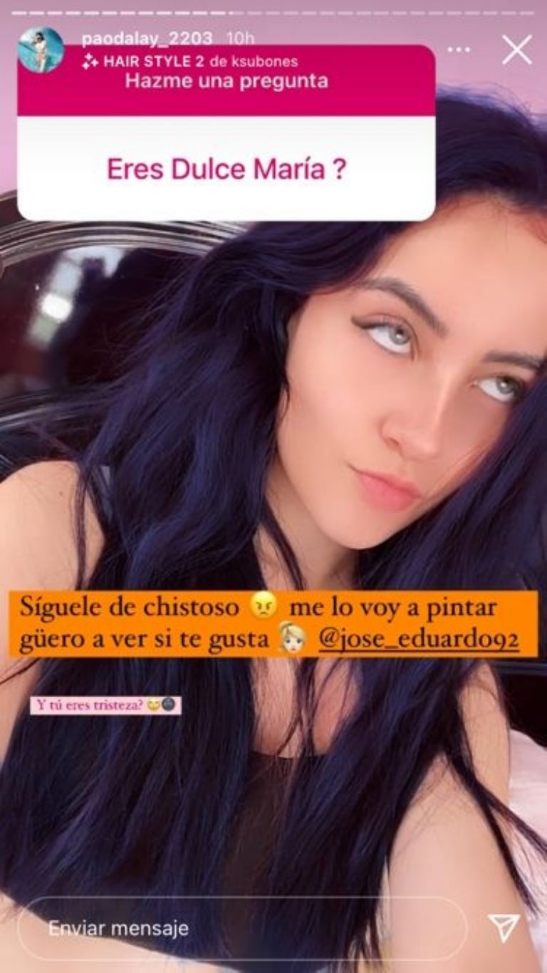 Recientemente llamó la atención la el mensaje que recibió al parecer de su pareja, el hijo de Eugenio Derbez, quien por medio de los anónimos comentarios primero escribió "Te amo" y posteriormente le dijo: "¿Eres Dulce María?".