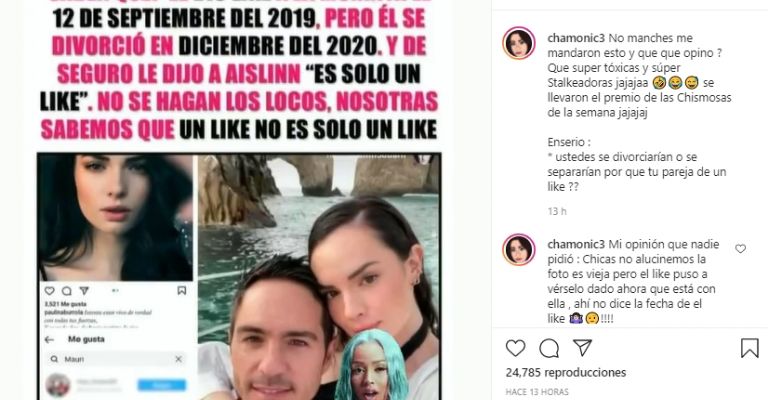¿Saben qué? Le dio Like a la morrita el 12 de septiembre del 2019, pero él se divorció en 2020 y de seguro le dijo a Aislinn 'solo es un Like'... no se hagan locos, nosotros sabemos que un Like no es solo un Like", dice la imagen.