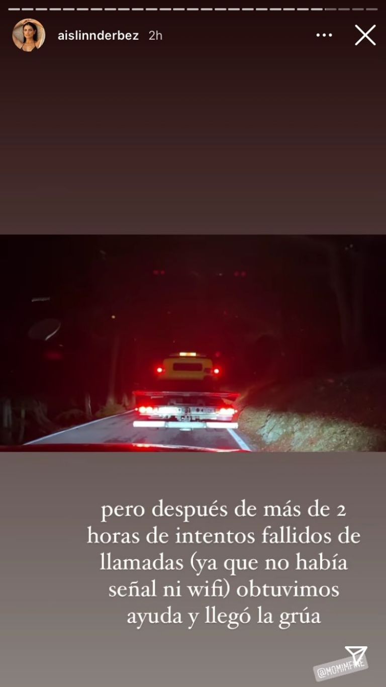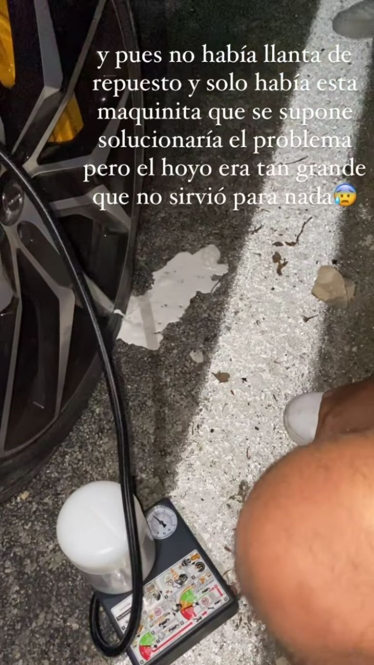 A la mitad del bosque, lejos del hotel, sin señal, ni wifi...Y pues, no había llanta de repuesto y solo había esta maquinita que se supone solucionaría el problema. Pero el hoyo era tan grande que no sirvió para nada", escribió la estrella en sus instastories.