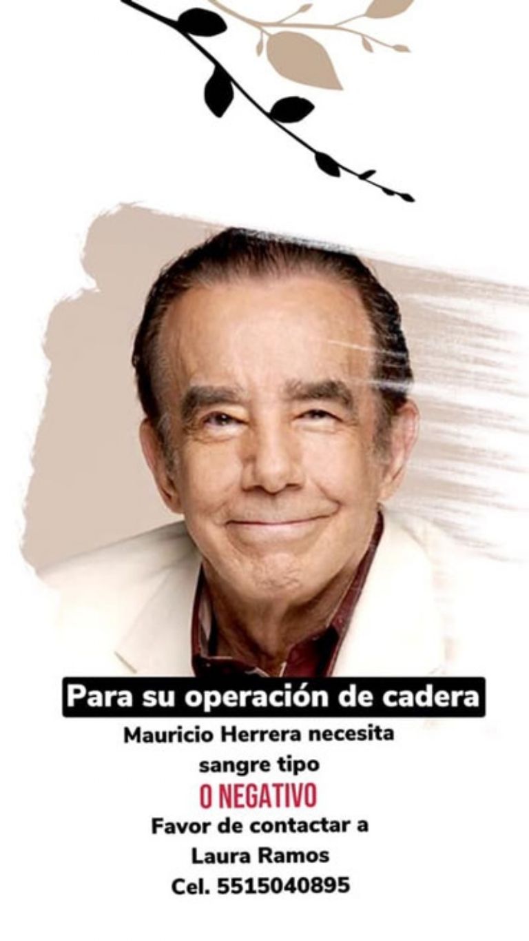 Si tú deseas apoyar al actor Mauricio Herrera donando sangre para su intervención de cadera, ponte en contacto con Laura Ramos al 551504 0895.