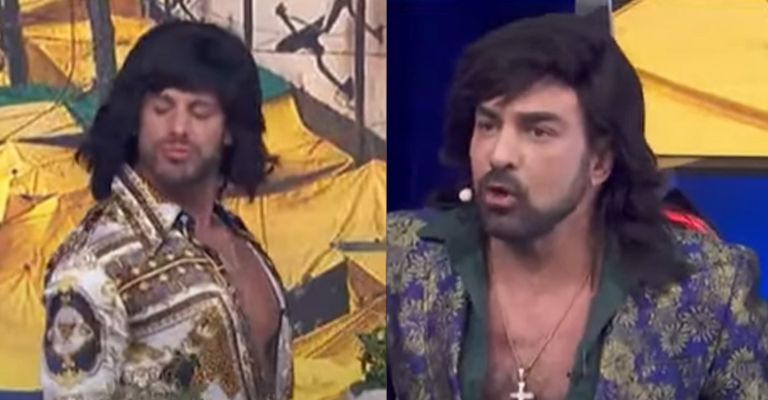 El conductor de Hoy lució una peluca con el mismo corte de cabello que luce 'Albertano', la típica camisa con estampado dorado y estilo 'buchón' y la cual llevaba desabrochada del pecho.