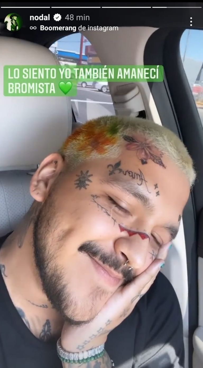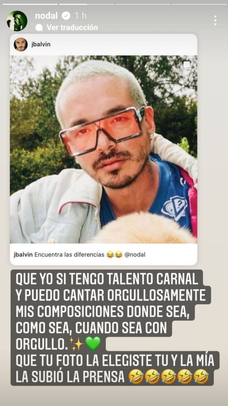 Esta publicación llegó a la vista de Nodal, quien no dudó en contestar a "la broma" respondiendo de manera tajante en sus historias: "Que yo sí tengo talento carnal y puedo cantar orgullosamente mis composiciones donde sea, como sea, cuando sea con orgullo"; el sonorense agregó: "que tu foto la elegiste tú y la mía la subió la prensa", además de algunas caritas riendo. Asimismo, afirmó que él "también amaneció bromista".