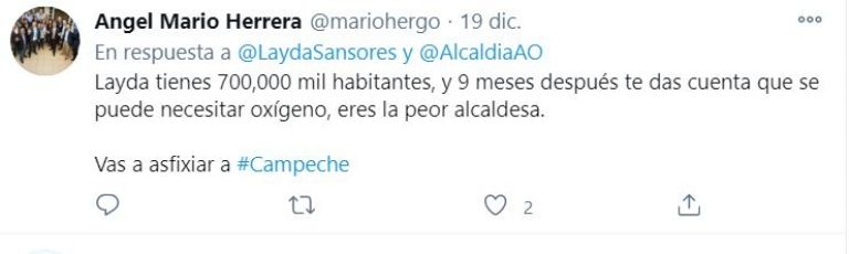 Ciudad de México.- La alcaldesa de Álvaro Obregón, en la Ciudad de México, Layda Sansores, reveló mediante una publicación en su cuenta de Twitter que apoyará a esta zona con 35 tanques de oxígeno ante el desabasto que existe para pacientes contagiados con Covid-19.