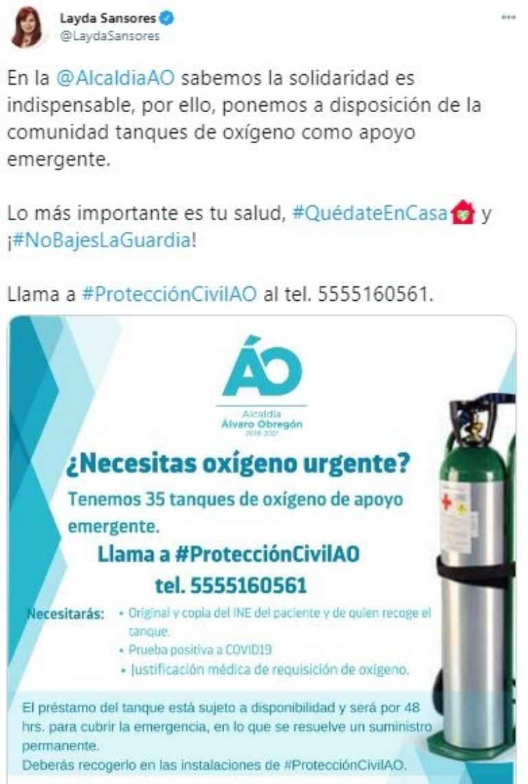 En la Alcaldía Álvaro Obregón sabemos la solidaridad es indispensable, por ello, ponemos a disposición de la comunidad tanques de oxígeno como apoyo emergente. Lo más importante es tu salud, Quédate en casa y ¡No bajes la guardia!”, se lee en le mansaje.