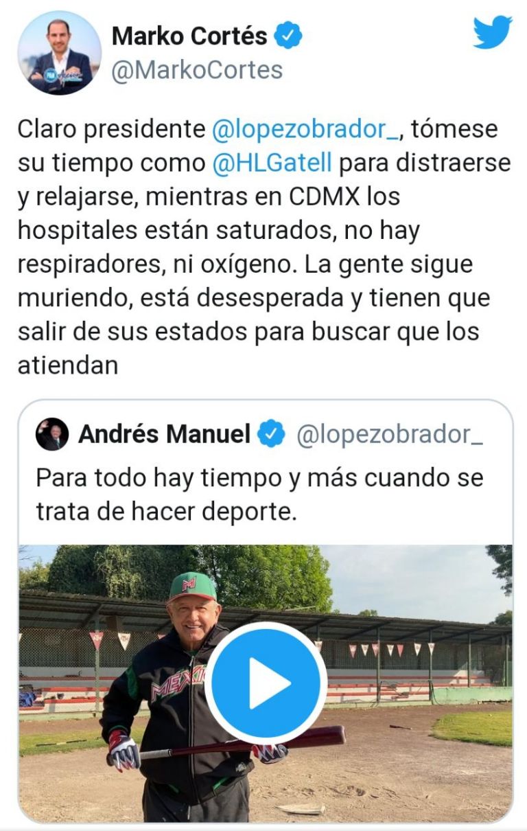 Ciudad de México.- Luego de que el presidente Andrés Manuel López Obrador se dejara ver relajado y jugando beisbol, el dirigente del PAN, Marko Cortés, le envió un mensaje para recordarle que la pandemia aún no ha terminado.