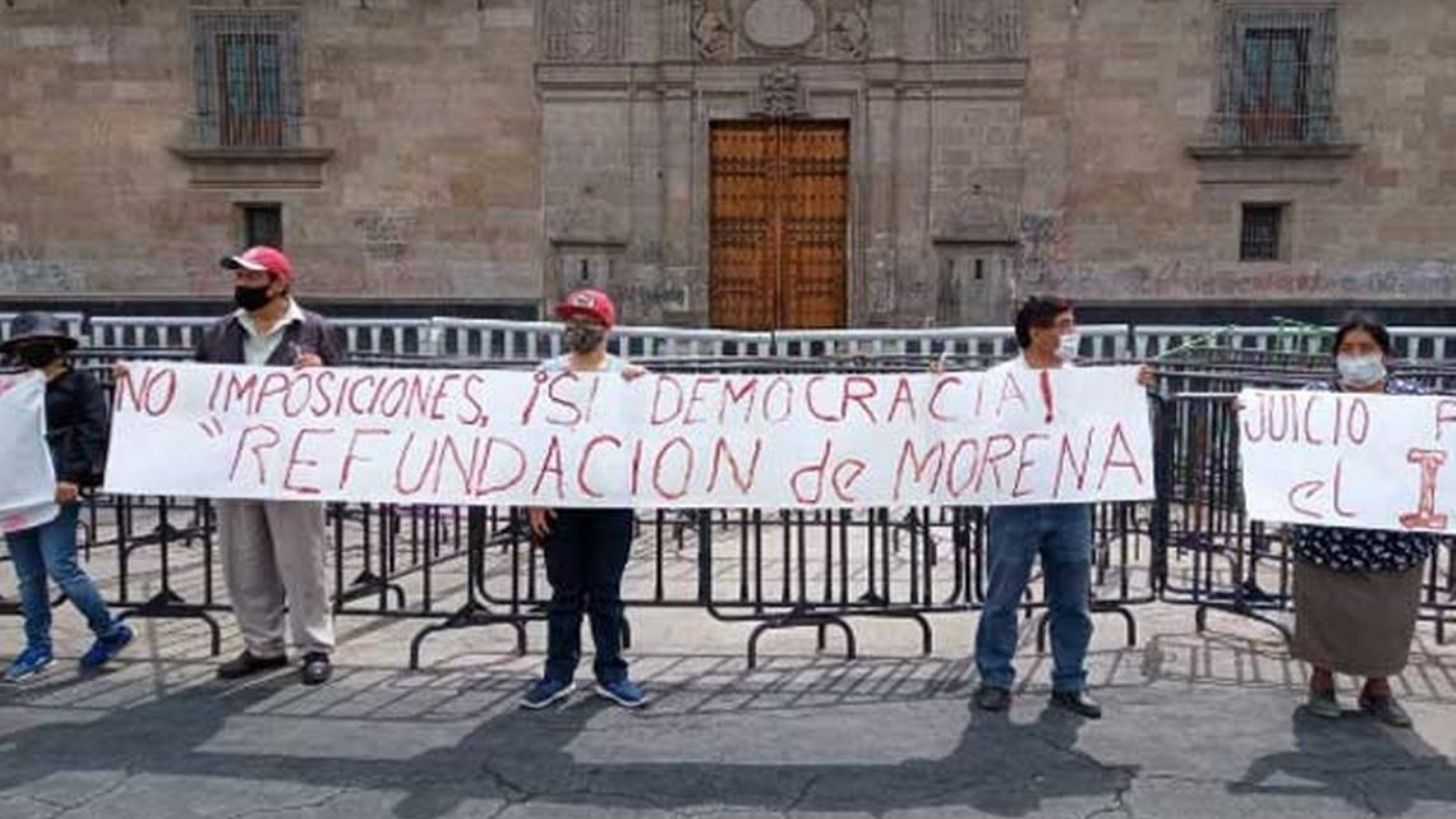 Ciudad de México.- Frente a Palacio Nacional, un grupo de aproximadamente 10 personas militantes del Movimiento de Regeneración Nacional (Morena), se manifestó con pancartas escritas con su propia sangre para exigir su participación en las elecciones.