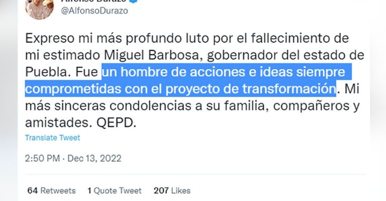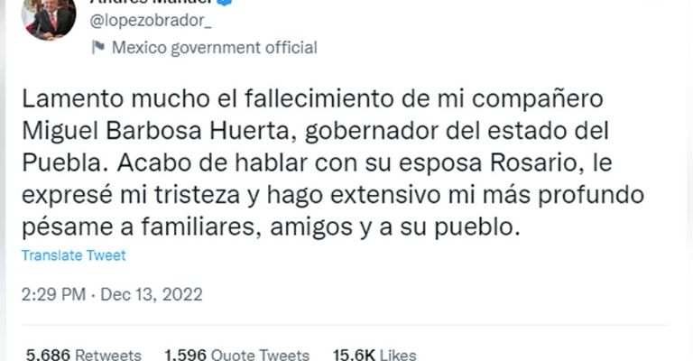 Puebla de Zaragoza, Puebla.- Luego que hace unas escasas horas se informara del lamentable deceso del gobernador constitucional del estado de Puebla, Miguel Ángel Gerónimo Barbosa Huerta, por medio de redes sociales muchas de las figuras más importantes de la política mexicana han emitido sus condolencias, entre las cuales destacan la del presidente de México, Andrés Manuel López Obrador (AMLO).