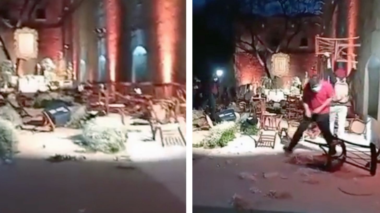 Los profesores lograron ingresar hasta el Patio del Huaje, en donde tendría lugar la bendición al enlace matrimonial y destruyeron los arreglos y las mesas que se habían realizado para que Elba Esther y Luis Antonio confirmaran su unión ahora en lo religioso, luego de haberlo hecho ayer por el civil.
