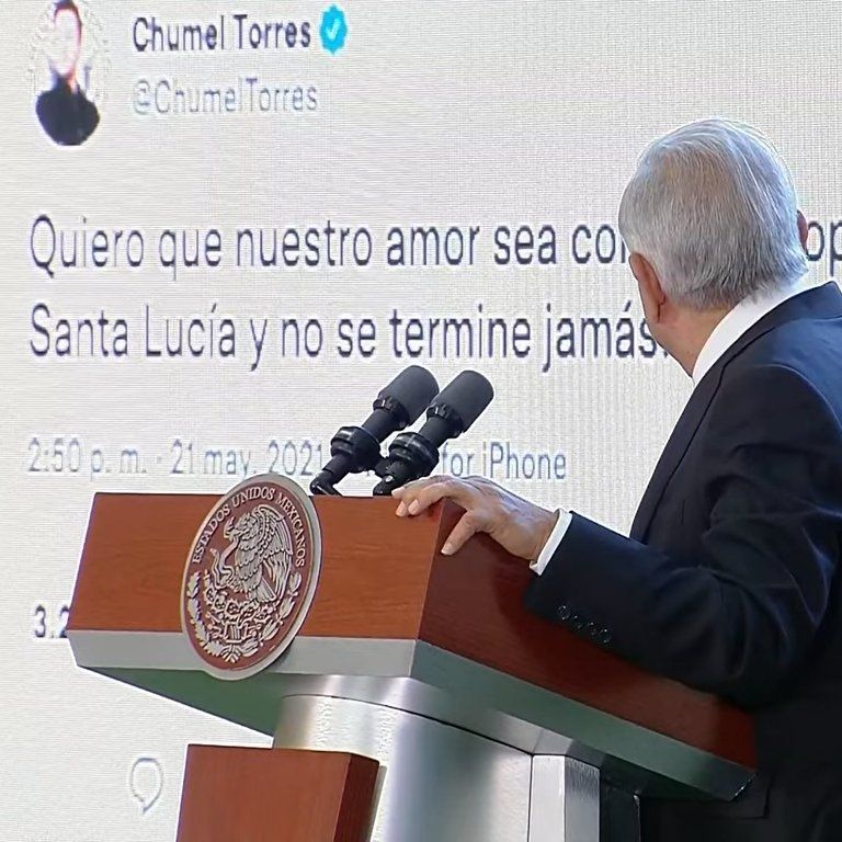 Ante representantes de los medios de comunicación y elementos de su gabinete y del gabinete ampliado, el mandatario federal exhibió la postura de Chumel Torres, youtuber y comediante que se ha caracterizado por lanzar criticas al Gobierno Federal aunque en esta ocasión, lo hizo en torno a dichas obras, motivo por el cual se refirió al AIFA como una ‘Central Avionera’.