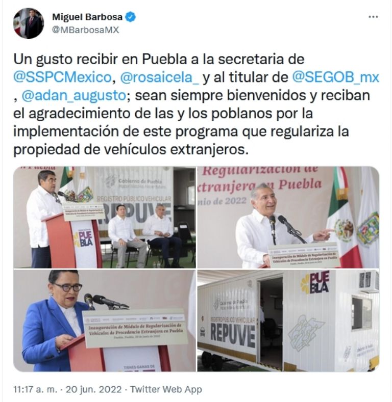 Agregaron que al integrarlos al programa se les otorga seguridad jurídica a los propietarios de los vehículos, mientras que reiteraron el compromiso del Gobierno Federal de implementar estrategias que mejoren el bienestar de la población, proteger el patrimonio familiar y garantizas la seguridad pública. El secretario de Gobernación, Adán Augusto López, y el gobernador de Puebla, Miguel Barbosa, estuvieron presentes en la inauguración del primer módulo de trámites en el estado; también asistieron el director general del Registro Público Vehicular (Repuve), Eduardo Bonilla, y el secretario de Seguridad Pública de Puebla, Daniel Cruz.