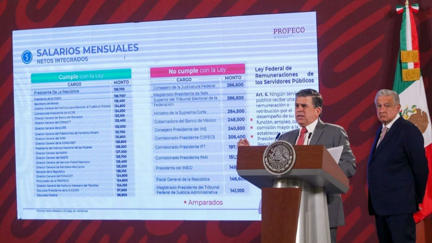 Ciudad de México.- En la conferencia de prensa matutina de este lunes 25 de julio del 2022, efectuada desde el Salón de la Tesorería en el Palacio Nacional con el mandatario mexicano Andrés Manuel López Obrador (AMLO), el titular de la Procuraduría Federal del Consumidor (Profeco), Ricardo Sheffield, compartió la sección 'Quién es quién' de los sueldos de los funcionarios públicos que tiene un sueldo mayor al del presidente de la República Mexicana.
