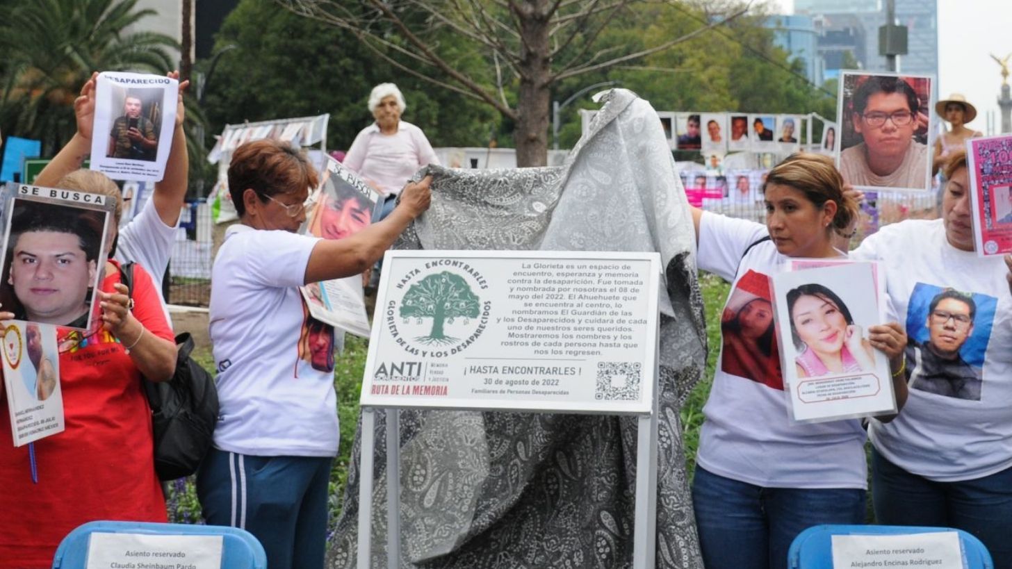 "La Glorieta es un espacio de encuentro y memoria contra la desaparición. Fue tomada y nombrada por nosotras el 8 de agosto del 2022. El Ahuehuete que se encuentra al centro, lo nombramos El Guardián de las y los Desaparecidos y cuidará de cada uno de nuestros seres queridos. Mostraremos los nombres y los rostros de cada persona hasta que nos los regresen", indica la placa que se colocó en el lugar.