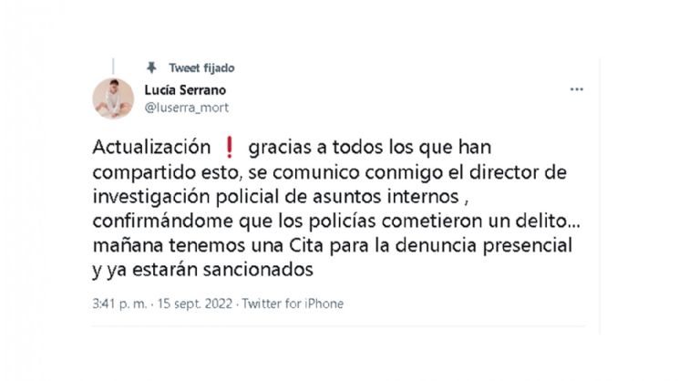 Ante los reportes de diversos usuarios de la red social, Lucía detalló que fue el propio director de investigación policial de asuntos internos quien se puso en contacto con ella: "Gracias a todos los que han compartido esto, se comunicó conmigo el director de investigación policial de asuntos internos, confirmándome que los policías cometieron un delito… mañana tenemos una cita para la denuncia presencial y ya estarán sancionados", concluyó.
