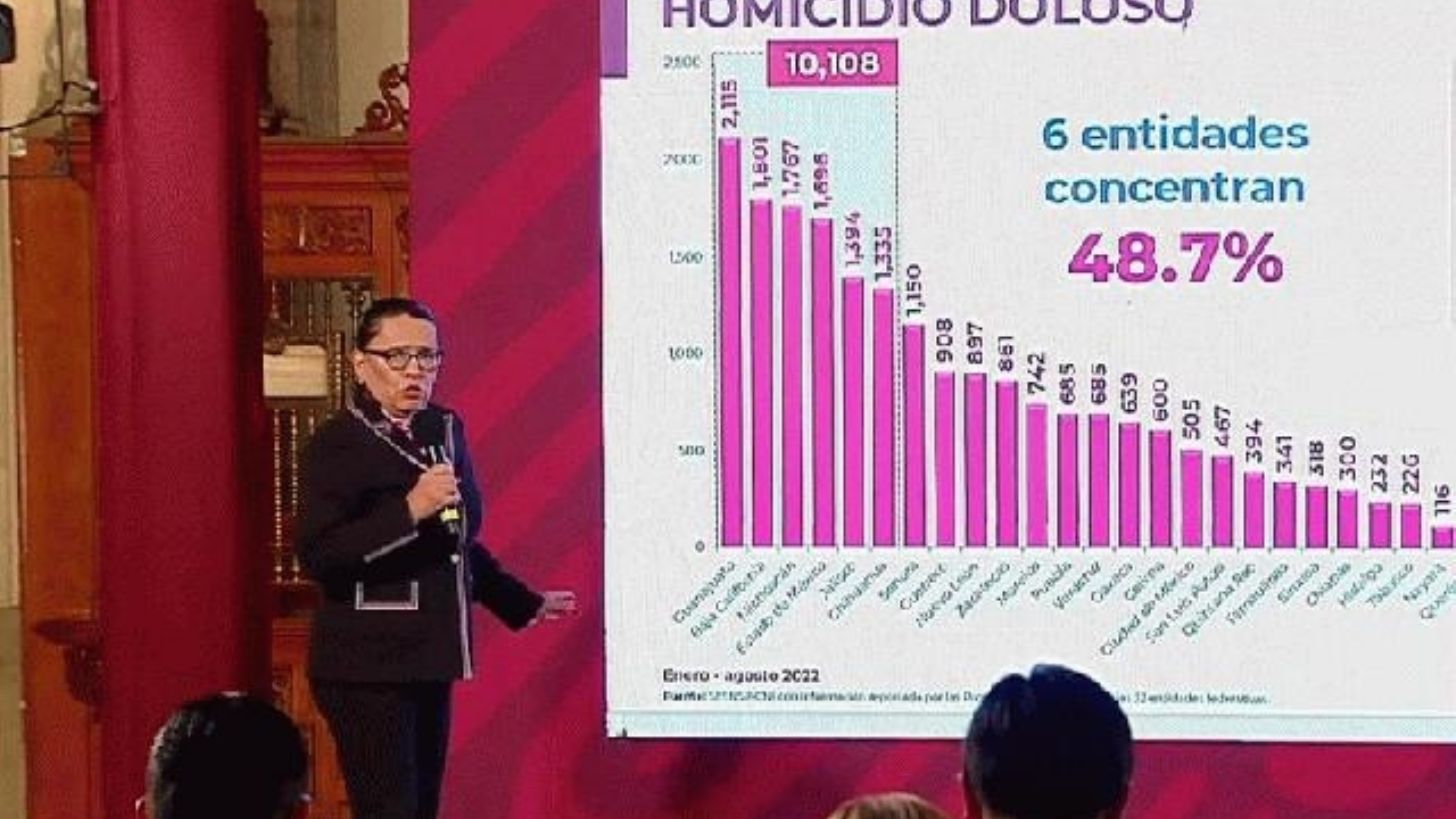Es el agosto más bajo [en homicidios dolosos] desde hace cinco años", declaró la funcionara de seguridad en la conferencia presidencial de AMLO.