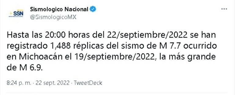 Ciudad de México.- Luego del sismo registrado durante la madrugada de este 22 de septiembre en la Ciudad de México de 6.9 grados con epicentro en Coalcoman, Michoacán, el jefe del Servicio Sismológico Nacional (SSN), Arturo Iglesias aseguró que ha sido una de las mayores réplicas que se han registrado derivadas del sismo ocurrido el pasado 19 de septiembre de magnitud 7.7 grados en la misma región.