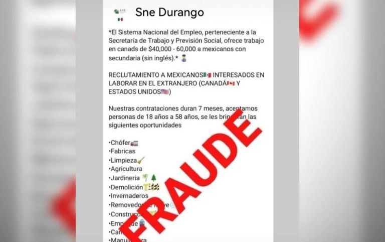 La funcionara duranguense detalló que estos grupos de redes sociales se ofrecen vacantes en Estados Unidos y en otros países a nombre de la Secretaría del Trabajo y hasta piden dinero a cambio de conseguirles la plaza laboral, sin embargo, puntualizó que estos son falsos, ya que el Sistema Nacional no cobra cuotas por ayudar a las personas a conseguir empleo fuera de México, por lo que pidió a la población estar atenta.