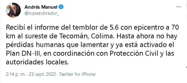 Recibí el informe del temblor de 5.6 con epicentro a 70 km al sureste de Tecomán, Colima. Hasta ahora no hay pérdidas humanas que lamentar y ya está activado el Plan DN-III, en coordinación con Protección Civil y las autoridades locales", escribió AMLO.