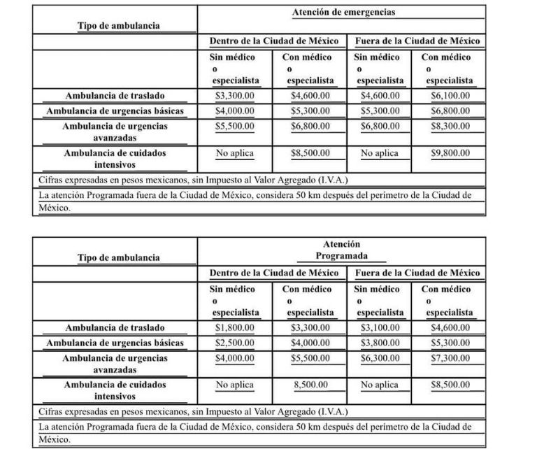 La dependencia capitalina detalló que las tarifas se establecieron en acuerdo con el Artículo 28 del Reglamento para Regular los Vehículos de Uso como Ambulancia que Circulan en la Ciudad de México, por lo mencionó que en caso de una ambulancia de traslados, se deberá contar con un operado Técnico en Atención Médica Prehospitalaria, que deberá estar capacitado en conducción de vehículos de pacientes ambulatorios, así como un copiloto Técnico en Atención Médica Prehospitalaria.