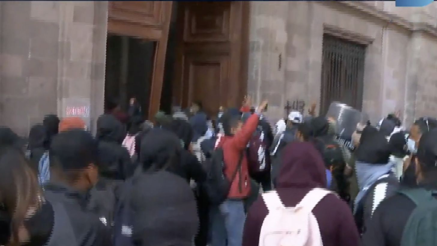 Ciudad de México.- Mientras se realizaba la conferencia presidencial 'mañanera' del mandatario Andrés Manuel López Obrador (AMLO) hoy, miércoles 6 de marzo del 2024, en el Salón de la Tesorería del Palacio Nacional, un grupo de estudiantes normalistas lanzaron petardos y chocaron una camioneta contra una puerta para irrumpir y encontrarse con el jefe del Ejecutivo Federal mexicano.