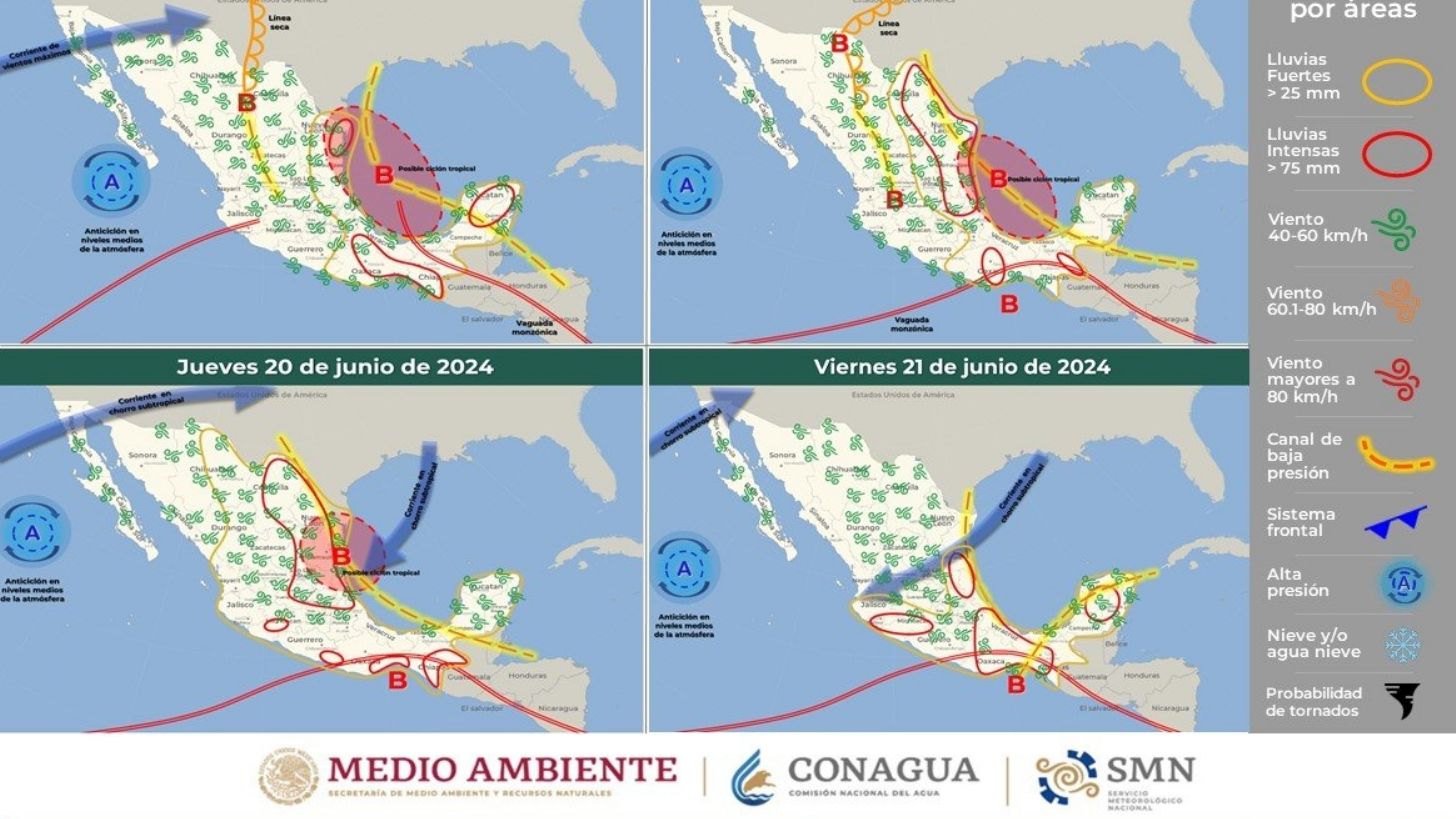 Campeche, México. - El Servicio Meteorológico Nacional (SMN) de la Comisión Nacional del Agua (Conagua) emitió un comunicado este lunes 17 de junio para alertar sobre la presencia de una zona de baja presión con potencial ciclónico. Según el informe, el fenómeno se localiza a 150 kilómetros al nor-noroeste de Sabancuy, Campeche, y tiene un 70 por ciento de probabilidad de convertirse en ciclón tropical en las próximas 48 horas, moviéndose hacia el oeste-noroeste.