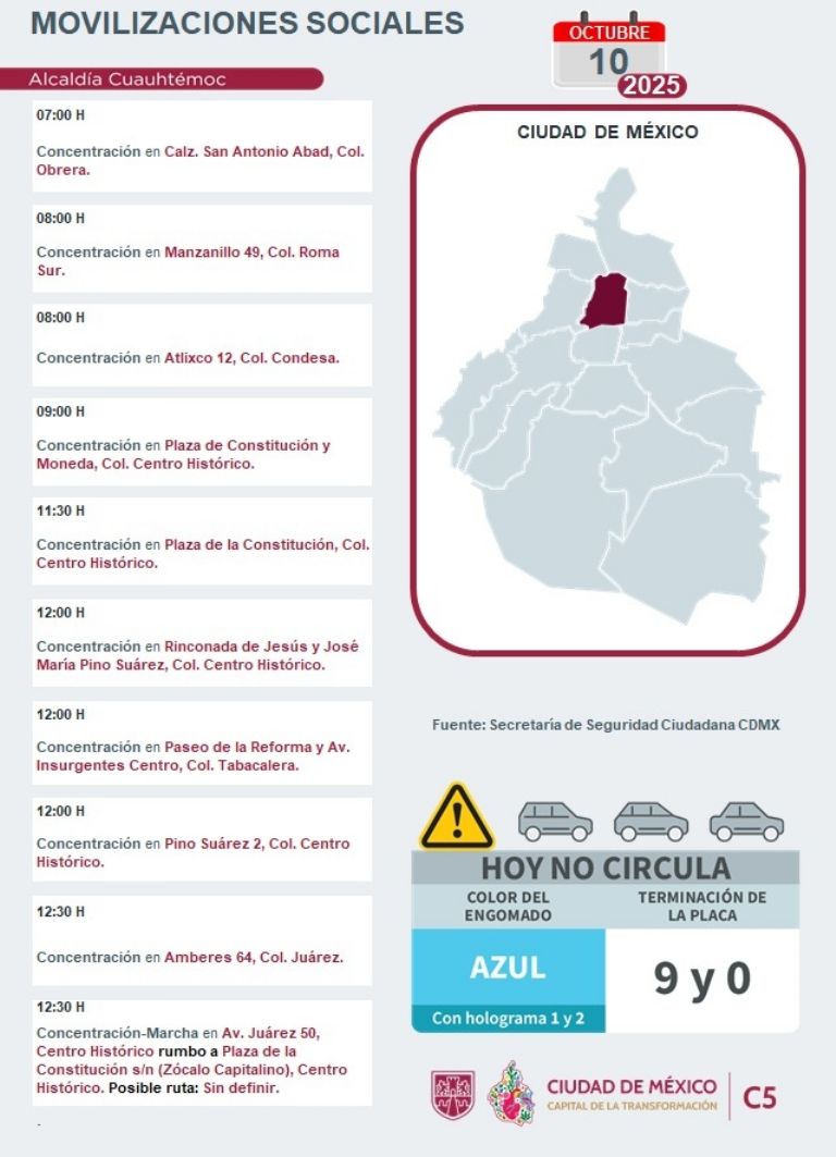 Ciudad de México.- Se espera tráfico en la CDMX para este 10 de octubre, debido a las diferentes marchas, bloqueos y movilizaciones programadas durante el día en la capital, sobre todo en las alcaldías Cuauhtémoc y Miguel Hidalgo. Por ello, las autoridades de la Ciudad de México piden a los automovilistas tomar las precauciones necesarias para no quedar varados en los embotellamientos, así como utilizar alternativas.